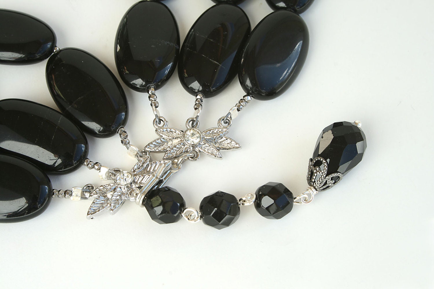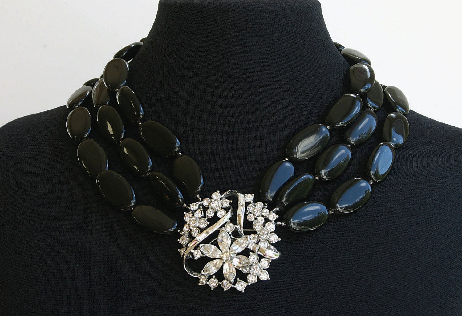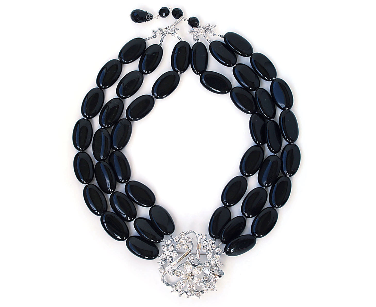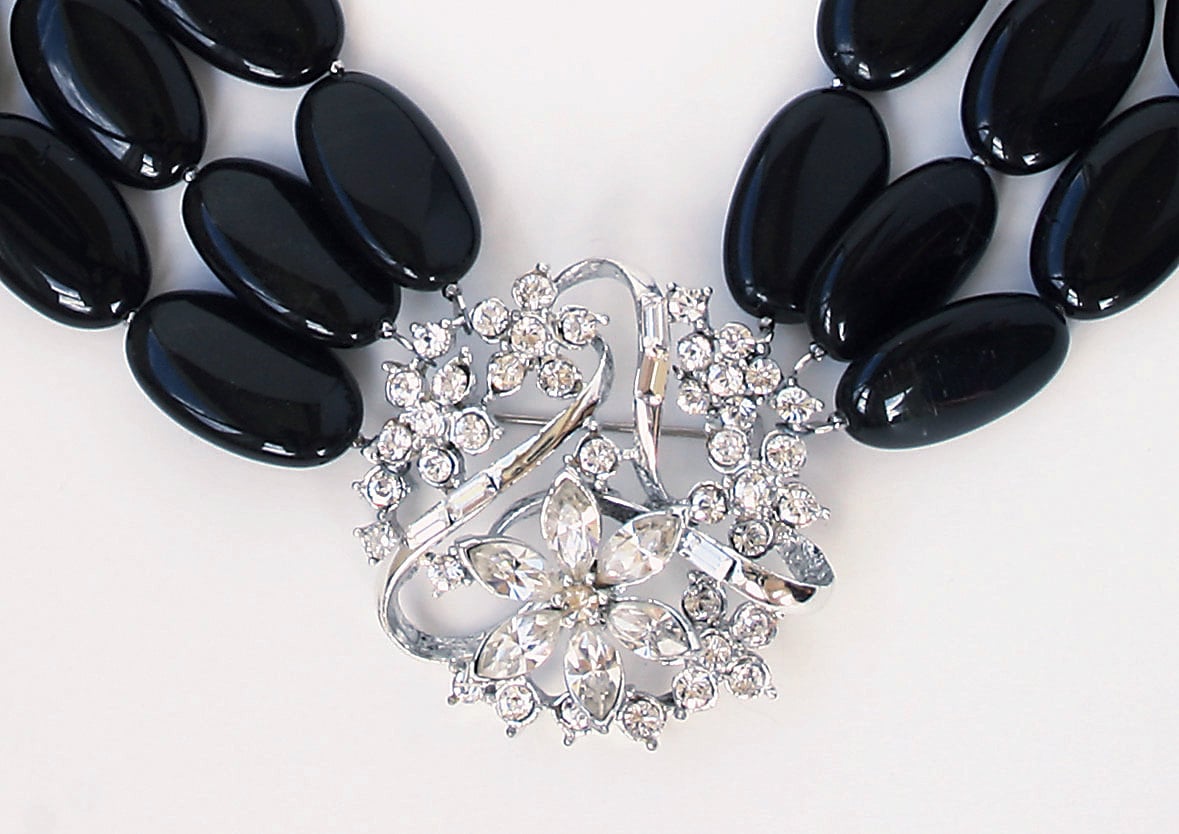 Statement Necklace Vintage Rhinestone Flower Brooch Multi Strand Black Obsidian