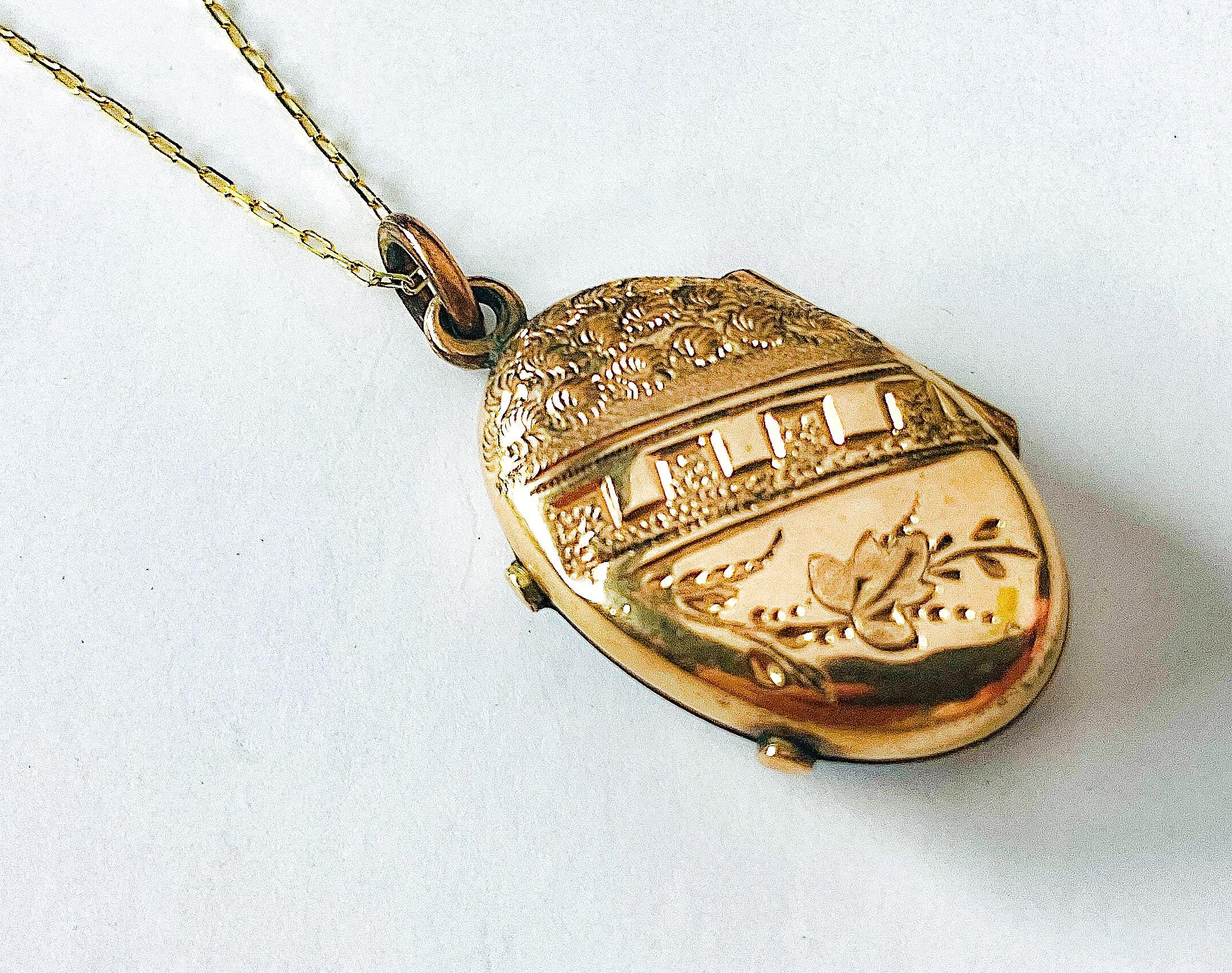 • Antique engraved & enameled oval gold filled locket is in great condition for its age (Circa late 1800s) with minimal wear. Most likely European make.