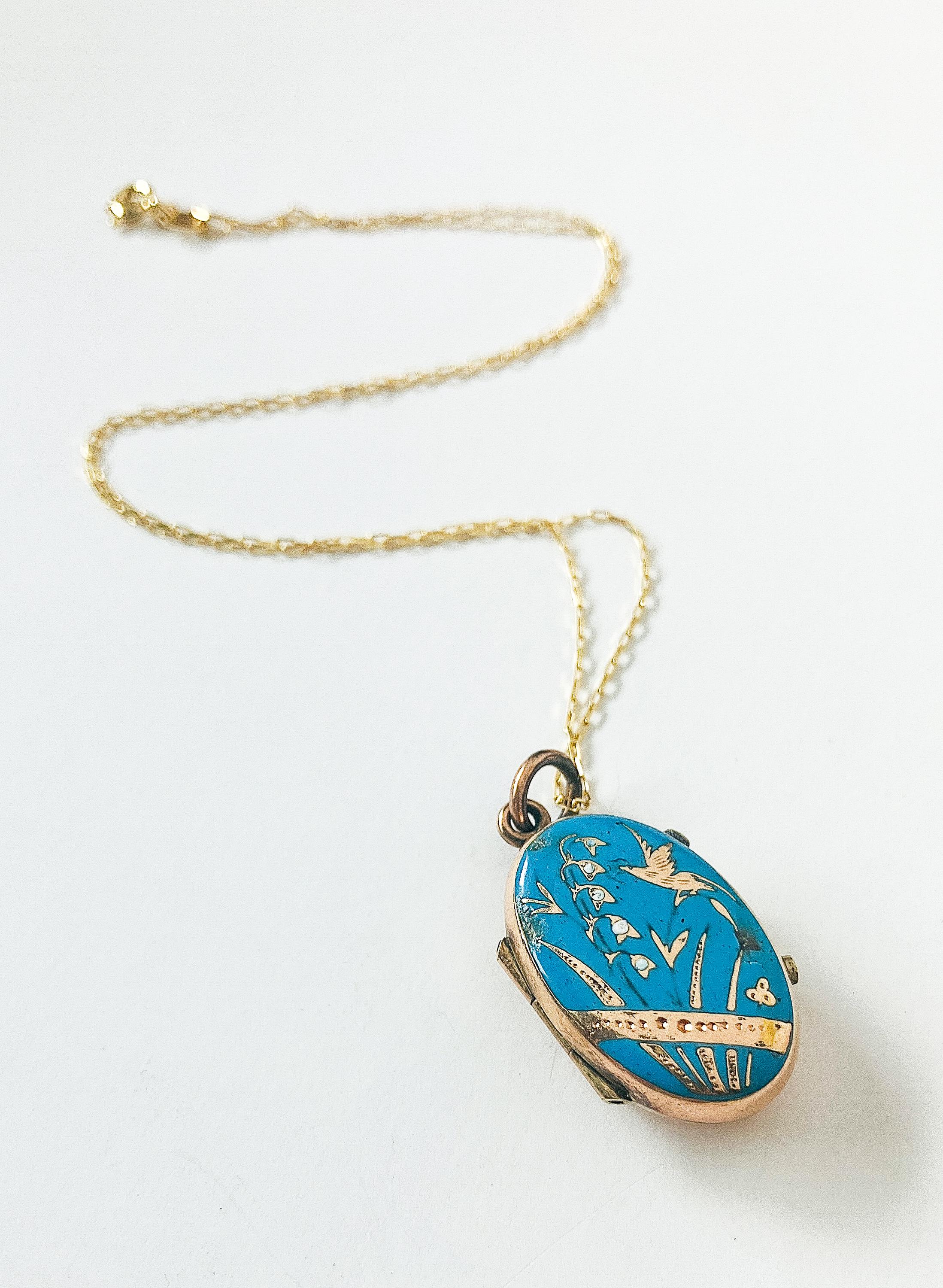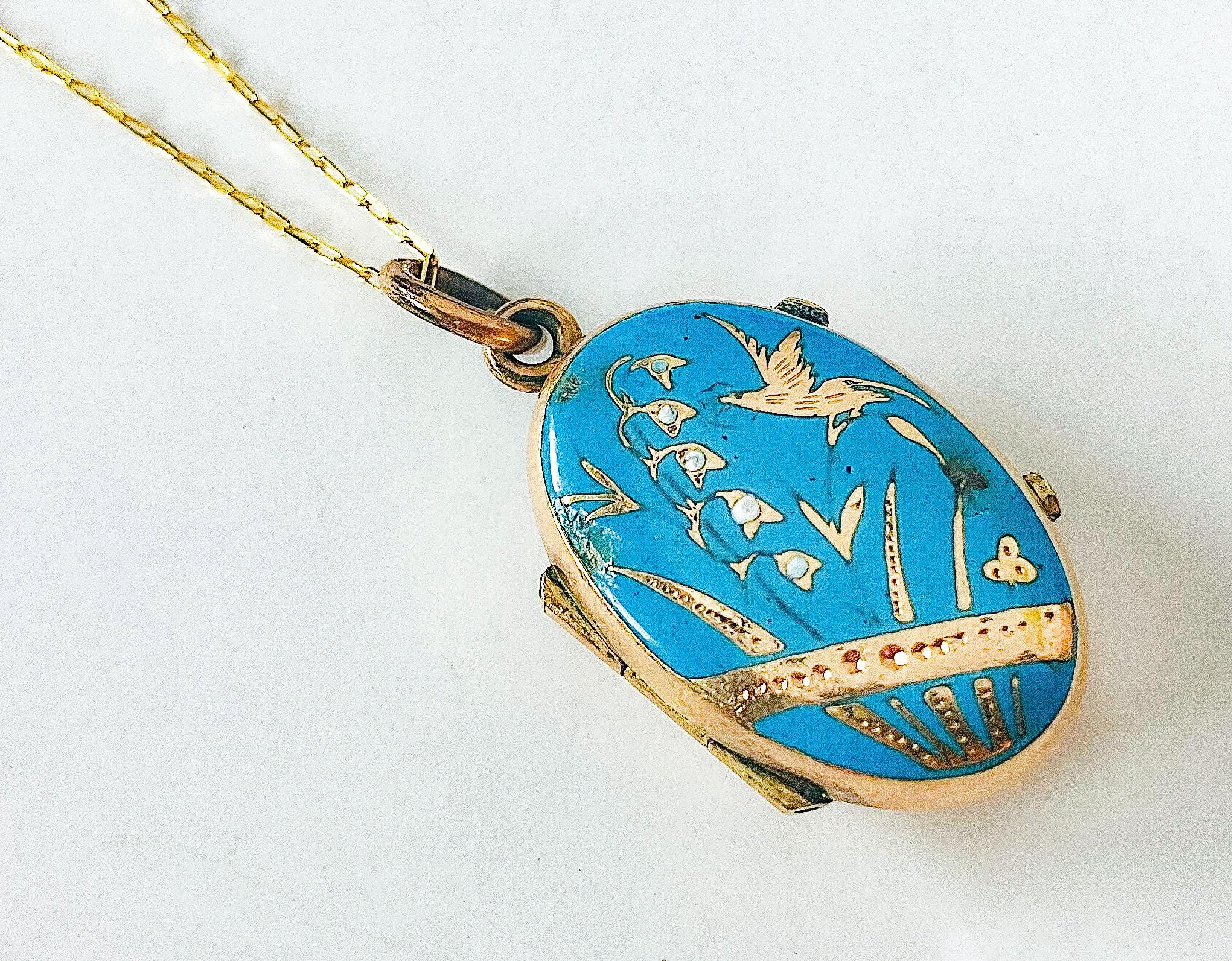 Antique Enameled Oval Engraved Lily Flower and Bird Motif Gold Filled Locket Necklace