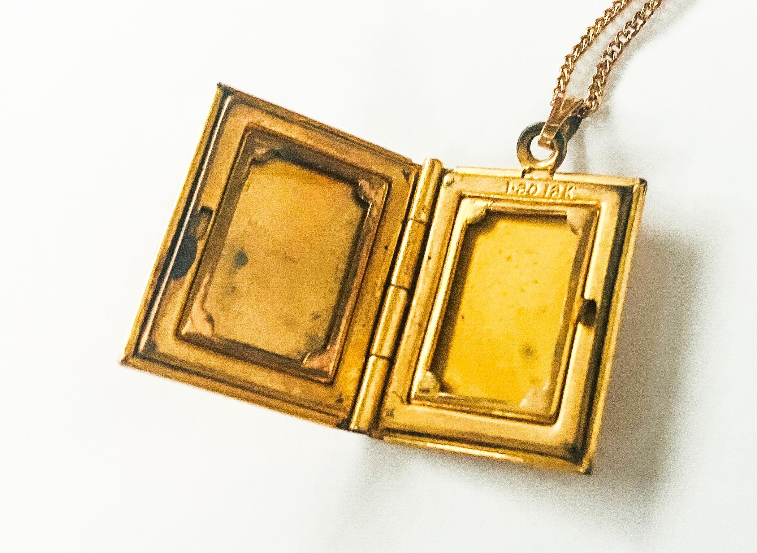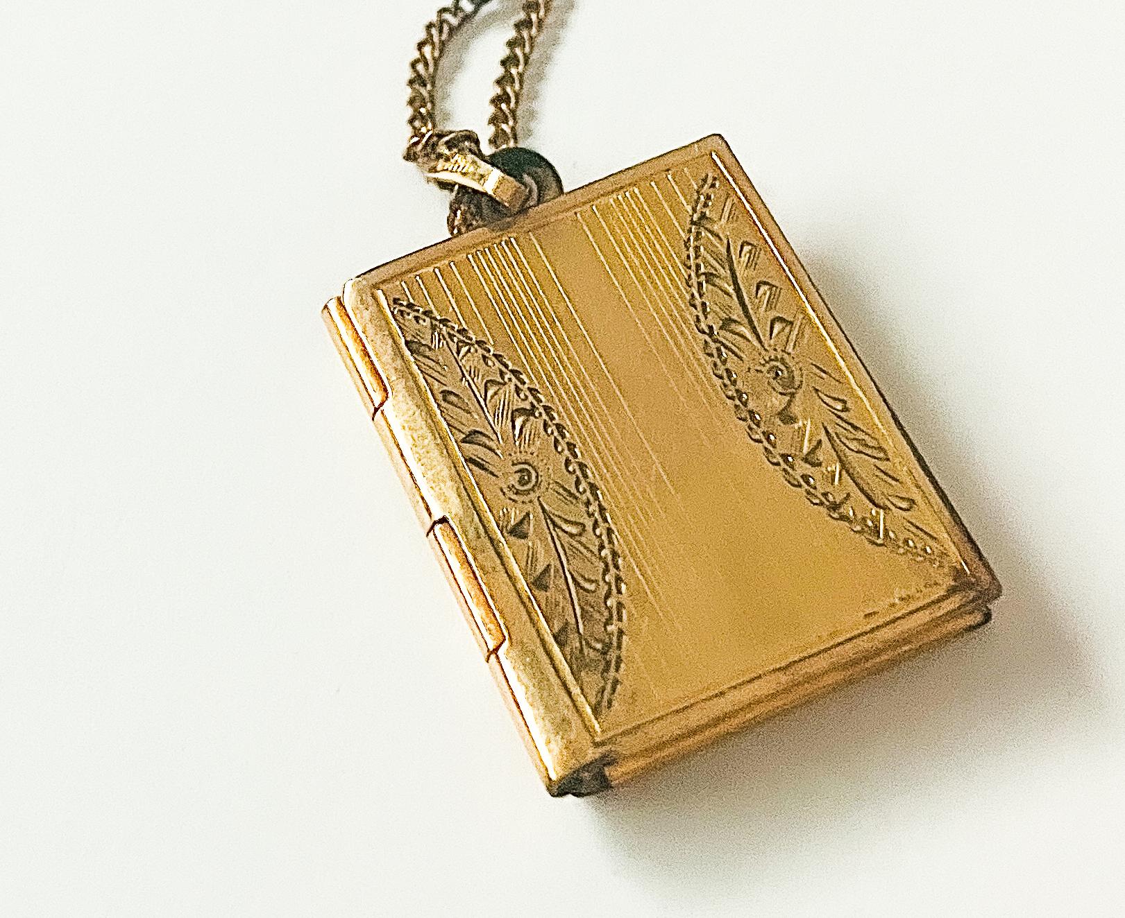 • This old vintage book motif locket is in great condition for its age (Circa 1930s-1940s) with minimal wear. The locket is rectangular in shape and features pin-striping and floral and scroll pattern hand engraved design along the edges.
