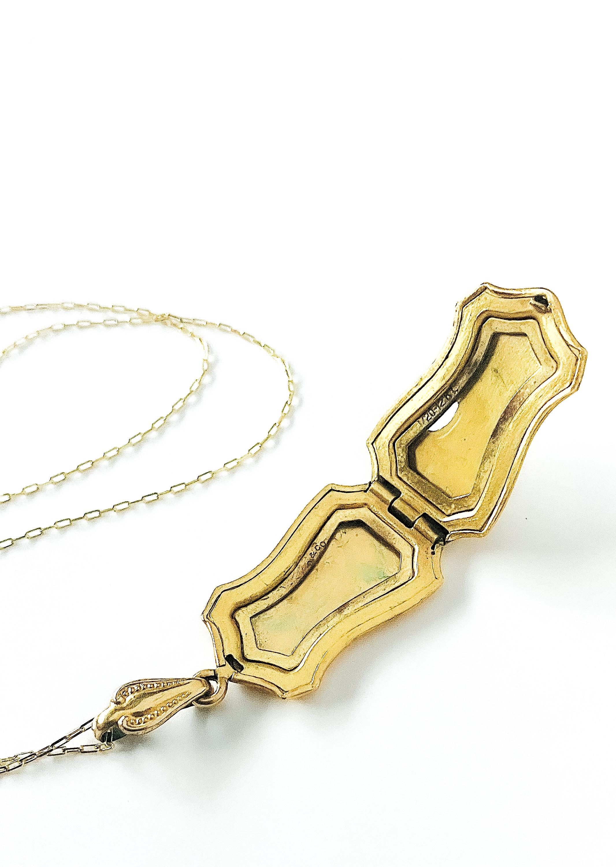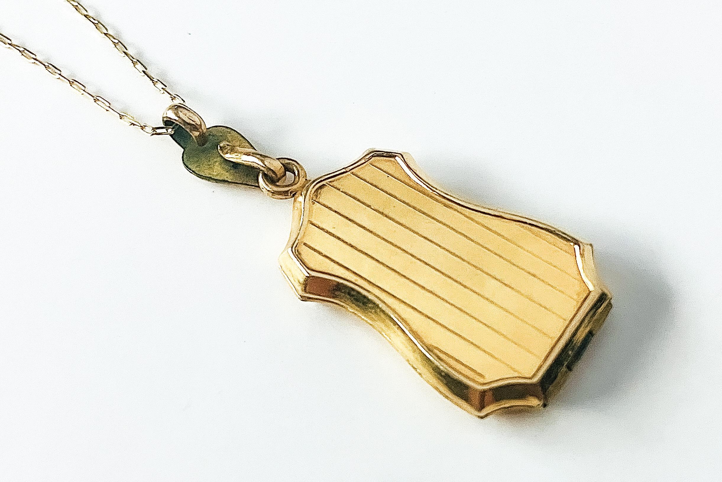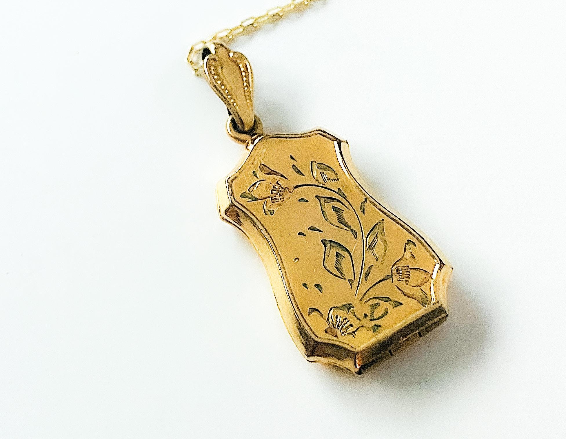 • Old Vintage engraved gold filled shield photo locket in a distinctive curvy hourglass shape (circa 1940s) is in very good condition for its age.