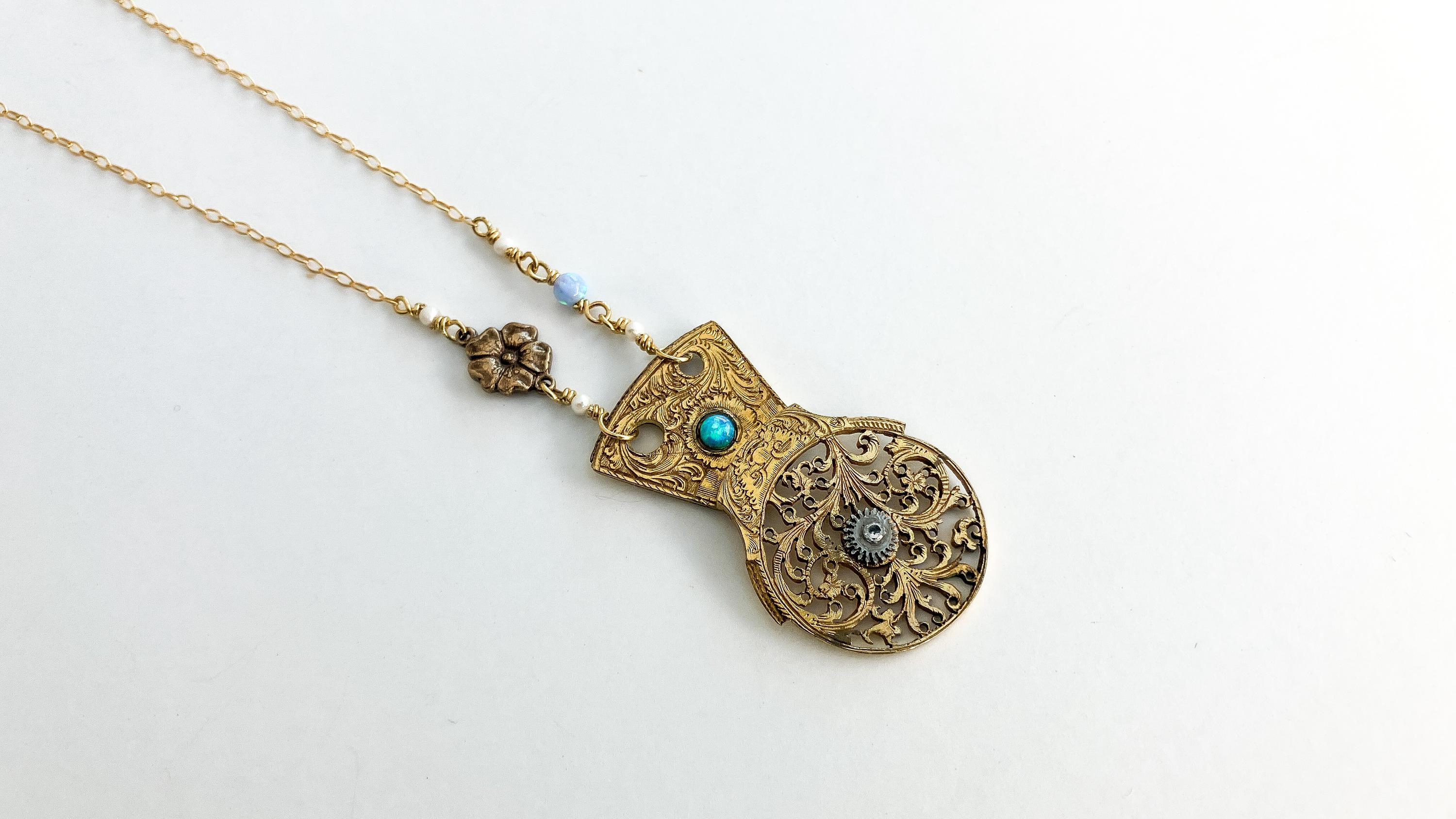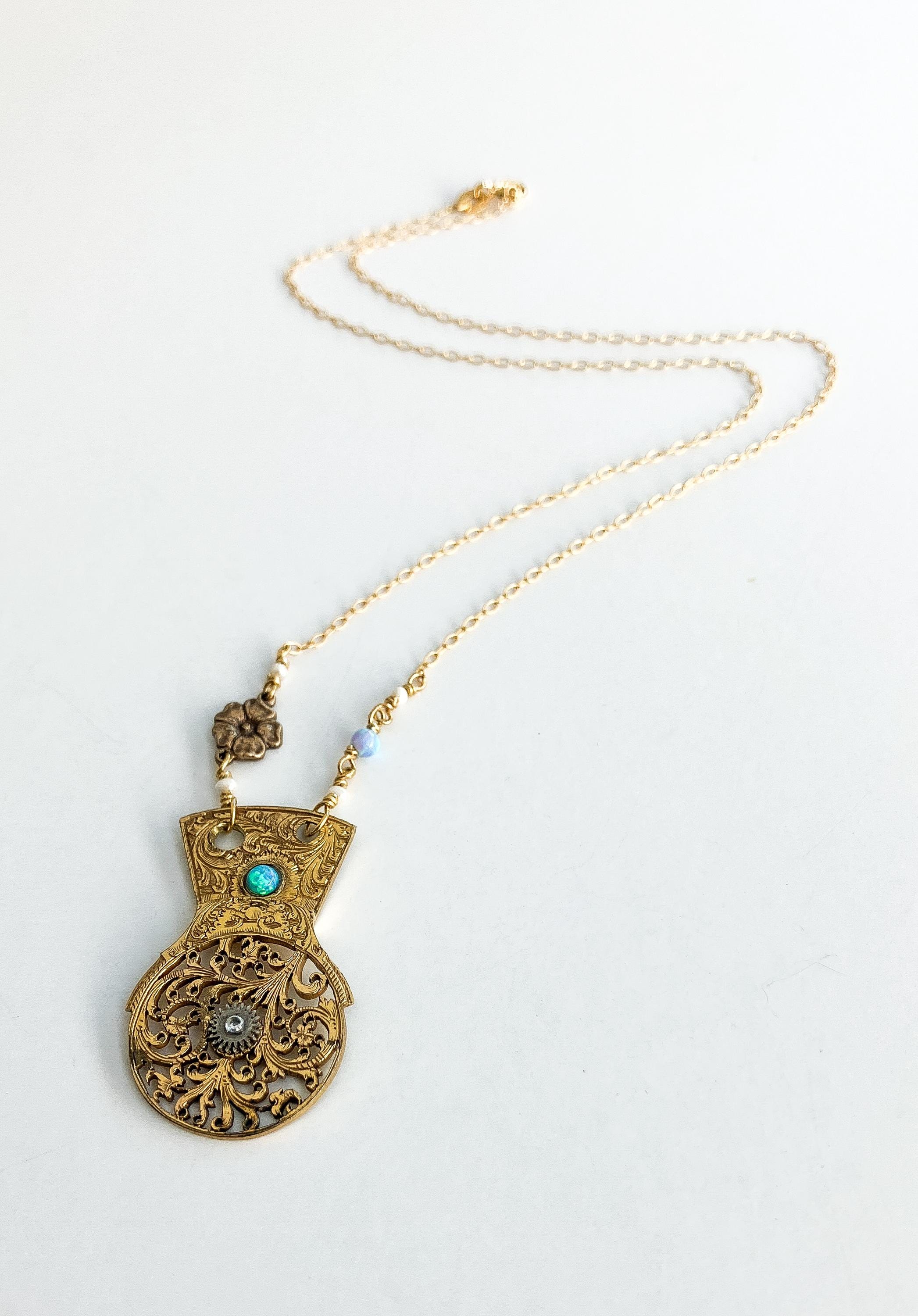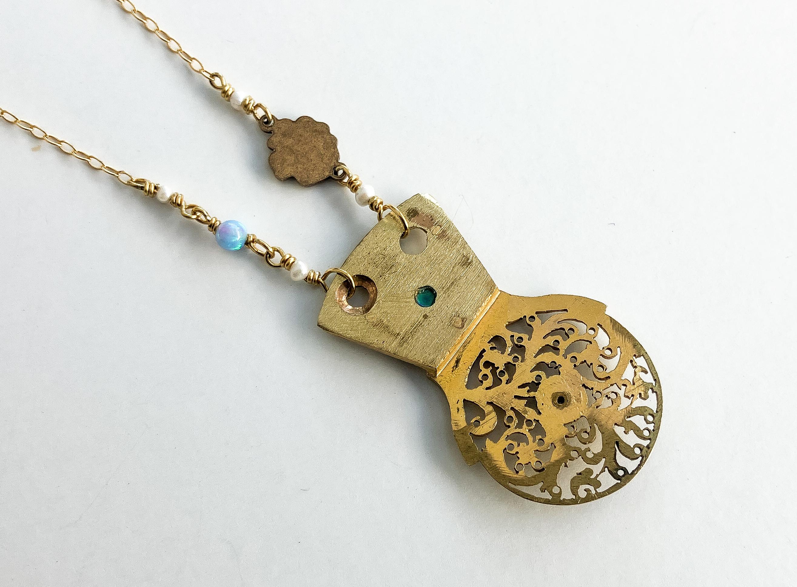 A remarkable English piece of high-end craftsmanship from the 1700s, is featured in this unique pendant design. I acquired a small collection from the UK of beautiful quality made watch pieces from Fusee pocket watches. These fine time pieces originated in France and caught on in popularity in England among the wealthy class. The watchmakers used small precision tools to cut the intricate filigree designs and hand engrave the gold gilt metal; among the fine detailed engraving on this small piece, there is an image of a man's face. I've added a small steel gear in the center of the filigree work and set a diamond inside the bore and also set an Ethiopian opal near the top. The pendant is attached to a contemporary vermeil (14K over sterling silver) chain by hand wire wrapped petite fresh water pearls, opal bead and small brass flower stamping for an interesting asymmetrical design. Chain length is 16". A truly remarkable reimagined, historic adornment, and a great conversational piece that would make a special and unique keepsake.