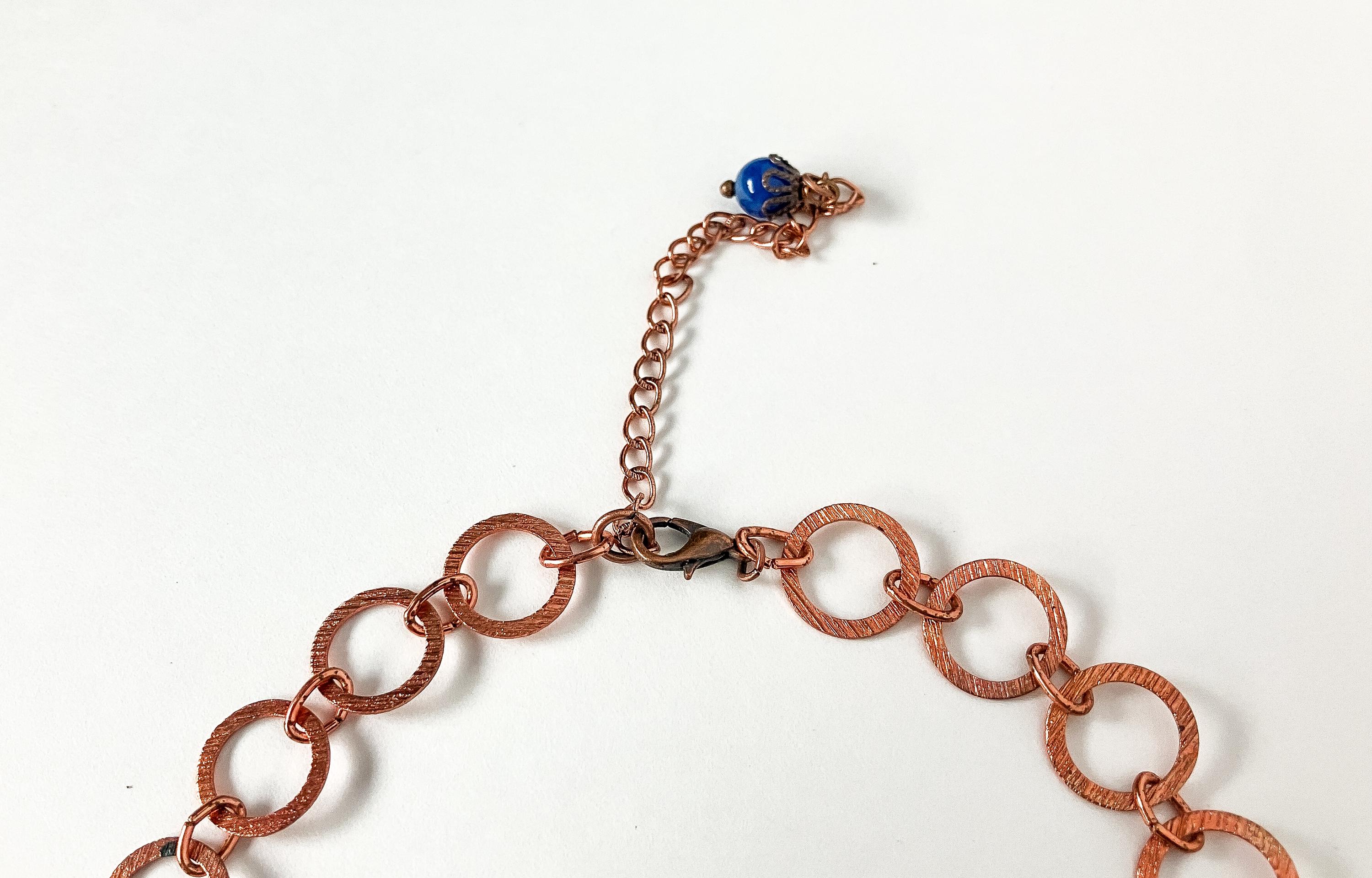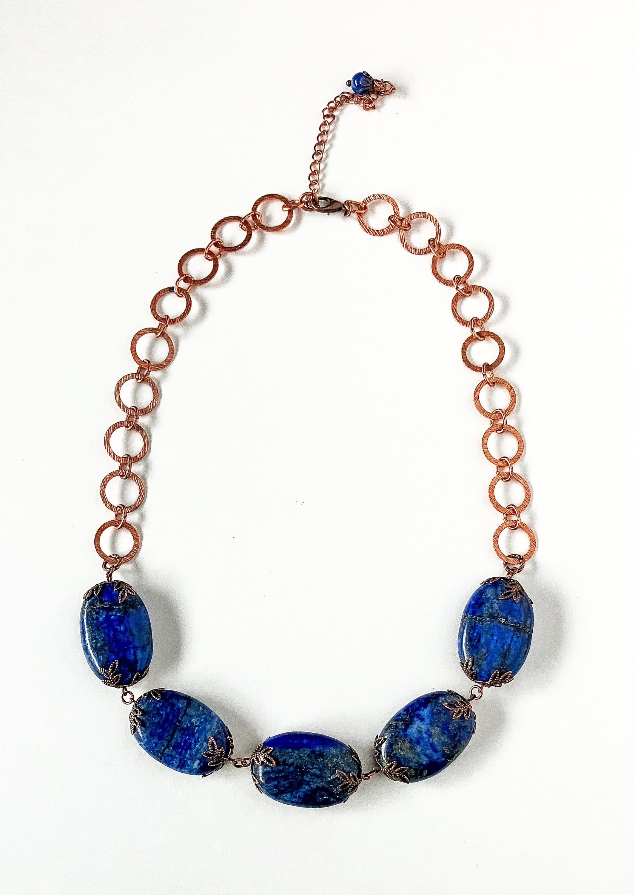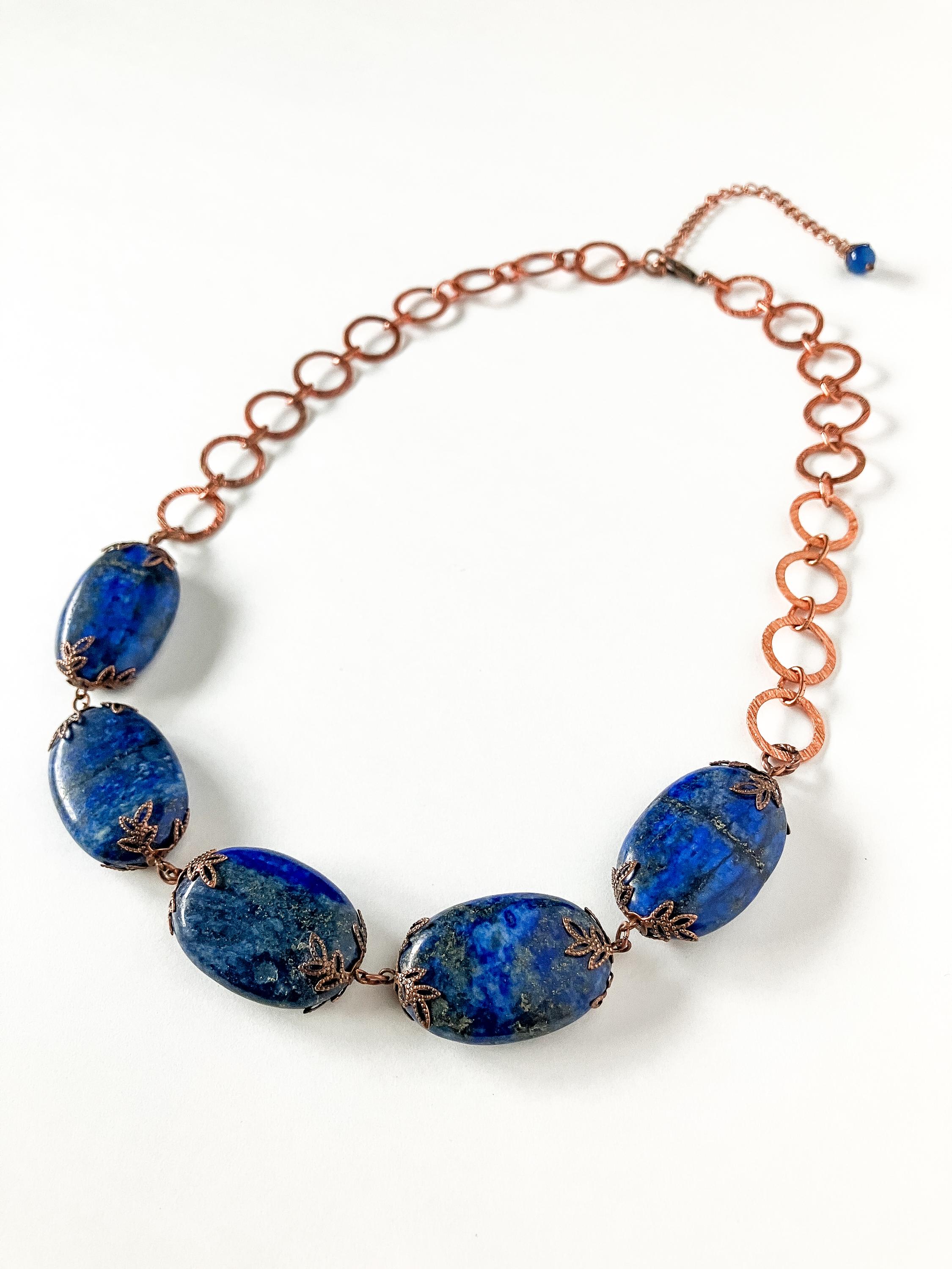 • Large lapis genuine gemstone oval beads with copper filigree leaf bead caps suspends from old vintage, quality textured round link copper chain.